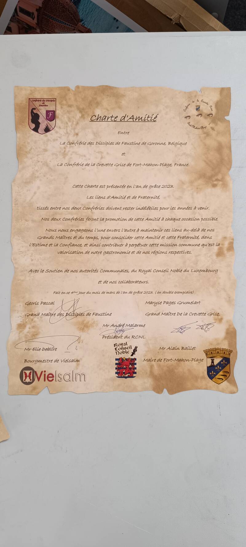 Lors de ce chapitre, une charte d'amitié et de fraternité a été signée entre nos deux confréries.